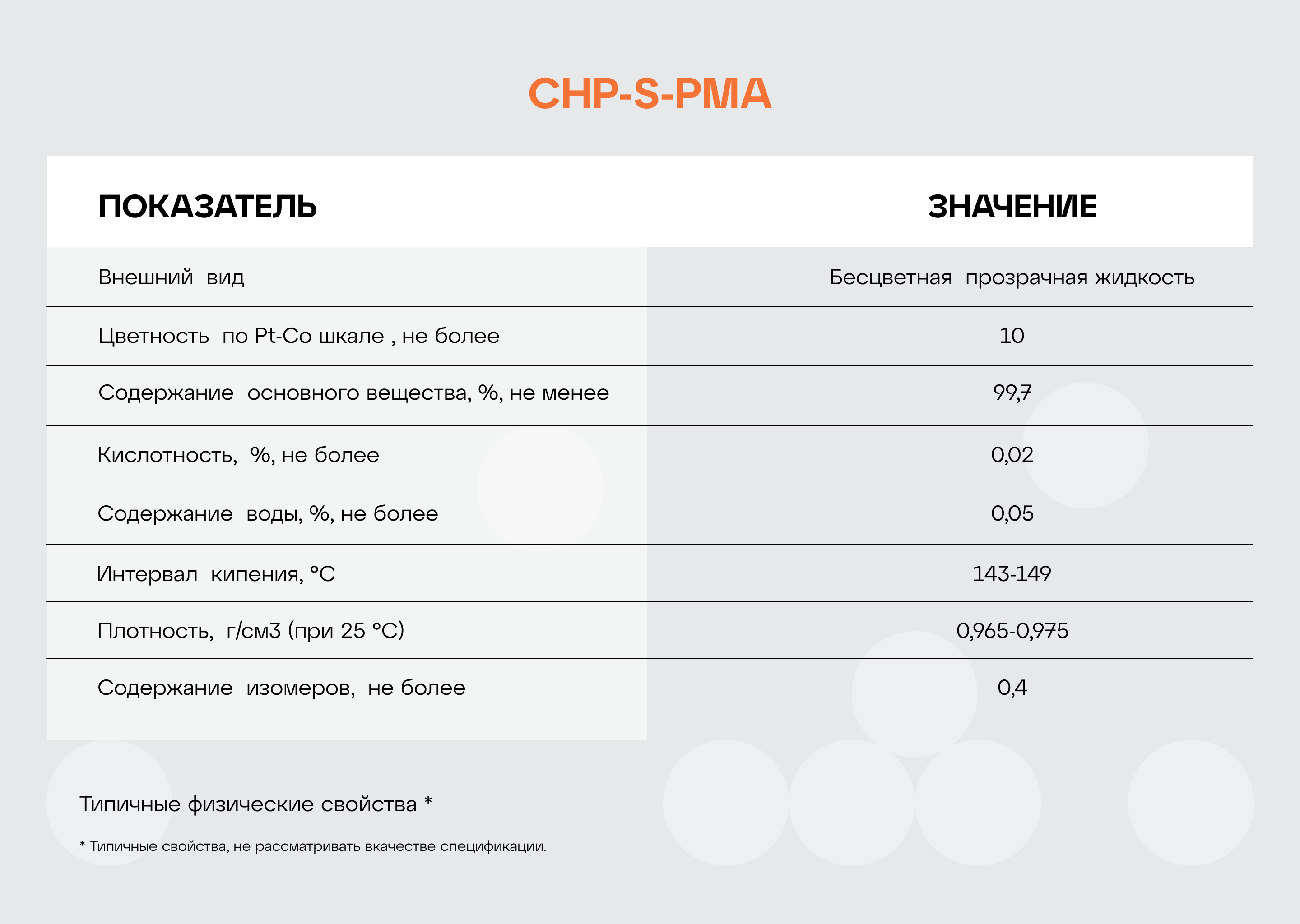 Метоксипропилацетат представляет собой слабо гигроскопичную прозрачную жидкость средней летучести с мягким запахом. Растворим в красках и смолах, а также хорошо смешивается со многими используемыми органическими растворителями: спиртами, кетонами, альдегидами, эфирами, гликолями и эфирами гликолей. Растворимость PMA в воде весьма ограничена.
